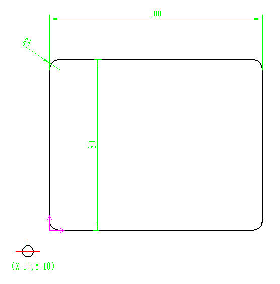 刀补参数设置: 刀补值D代码需对应实际刀具半径,如Φ10铣刀半径补偿值设为5mm;磨损后可直接修改D值(如磨耗0.02mm则改为4.98mm) 原理: 顺铣:加工外轮廓时刀具位于工件的左侧,应该用左补偿G41(内轮廓时刀具在工件右侧所以用G42) 外轮廓加工示例 | 【开头】<br/>G90 G94 G17<br/>T01 M06<br/>S2000 M03<br/>G00 X-10 Y-10 Z5<br/>【建立刀补】<br/>G01 Z-3 F200 #下切至加工深度<br/>G41 G01 X5 Y0 D01 F100 #在插补运动中建立刀具左补偿<br/>【加工轮廓】<br/>G02 X0 Y5 R5<br/>G01 Y75<br/>G02 X5 Y80 R5<br/>G01 X95 <br/>G02 X100 Y75 R5<br/>G01 Y5<br/>G02 X75 Y0 R5<br/>G01 X5 <br/>【结束】<br/>G40 G01 X-10 Y-10 F200 #取消刀补返回安全点<br/>G00 Z5 #抬刀<br/>M30 |  | | ------------------------------------------------------------ | ----------------------------------------------------- |