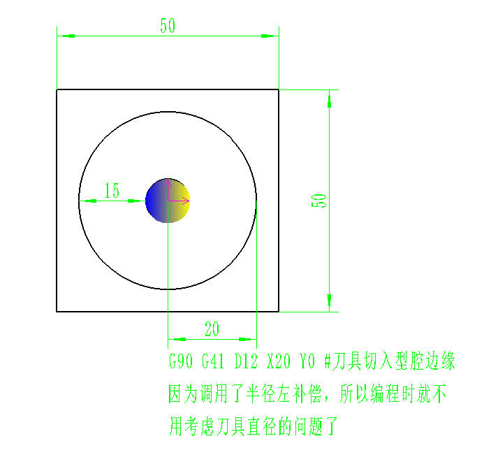 刀补补偿: G10 L1 P1 R40 #修改参数,设置1号刀具偏移值,寄存器编号是1,半径补偿值是40 | G90 G10 L12 P12 R6 | 在程序初始化阶段,将12号刀具的长度补偿值写入系统寄存器,相当于告诉系统:"12号刀的实际长度比标准刀长6mm | | ------------------ | ------------------------------------------------------------ | | G43 H12 Z50 | 在加工执行阶段,激活12号刀的长度补偿,并移动至Z50位置,系统动作:读取H12寄存器中的补偿值(6mm),将刀具实际移动到 Z50 + 6 = Z56 的位置。<br>若省略 G10 L12 直接使用 G43 H12,系统会调用H12寄存器中存储的旧值 | | | 解析:<br/>G10:刀具补偿设置指令,用于设置刀具相关补偿参数<br/>L12:刀具长度补偿设置,通常L12表示刀具长度补偿,不同系统可能有差异<br/>P12:刀具号,通常每把刀具独立对应P参数,如T05对应的就是P05<br/>R6:为T12刀具设置的补偿值 | 以下是一个完整的加工程序示例,展示 **`G10L12` 参数设置**与 **`G43` 补偿调用**的配合流程。 在 **50×50×10的立方体工件中心**铣削一个 **Ø40×5mm 的圆形型腔**,刀具为 **Ø10 平底铣刀(T12)**: | 【---初始化---】<br/>G17 G21 G40 G49 G90<br/>T12 M06<br/>G90 G10 L12 P12 R6 #设置12号刀具的长度补偿值是6mm<br/>G54 G90 G00 X0 Y0 #快速定位至工件中心<br/>M03 S4000<br/>G43 H12 Z50 #调用12号刀具的长度补偿,z轴抬至安全高度<br/>【---开始加工---】<br/>Z2<br/>G01 Z-1. F800 #往下切1mm<br/>G91 G01 Z-1. F1500 #再往下切1mm<br/>G90 G41 D12 X20 Y0 #半径左补偿,切入型腔边缘<br/>G03 I-20 J0 #走一圈圆弧<br/>G01 G40 X0 Y0 #取消补偿,返回中心<br/>G00 Z50<br/>M05<br/>G91 G28 Z0<br/>M30<br/><br/>解析:<br/>G10:刀具补偿设置指令,用于设置刀具相关补偿参数<br/>L12:刀具长度补偿设置,通常L12表示刀具长度补偿,不同系统可能有差异<br/>P12:刀具号,通常每把刀具独立对应P参数,如T05对应的就是P05<br/>R6:为T12刀具设置的补偿值<br/>G90 G10 L12 P12 R6:在程序初始化阶段,将12号刀具的长度补偿值写入系统寄存器,相当于告诉系统:"12号刀的实际长度比标准刀长6mm<br/>G43 H12 Z50:在加工执行阶段,激活12号刀的长度补偿,并移动至Z50位置,系统动作:读取H12寄存器中的补偿值(6mm),将刀具实际移动到 Z50 + 6 = Z56 的位置。<br/><br/>若省略 G10 L12 直接使用 G43 H12,系统会调用H12寄存器中存储的旧值 |  | | ------------------------------------------------------------ | ----------------------------------------------------- | **长度补偿功能G43** ``` #H1:刀具长度补偿值设为20 #H2:刀具长度补偿值设为30 G90 G43 H1 Z100; #Z轴移动至120 G90 G43 H2 Z100; #Z轴移动至130 ``` 举示例说明 ZD10钻头的钻头尖长4mm,钻通孔时,我们需要往下多钻4mm才能钻通,因为我们编程的假想z原点是钻头尖,如果我们在刀具补偿寄存器里将H1设为4,那么这个通孔就会直接被钻通(例如孔深5mm+钻头尖4mm=实际钻孔距离9mm,虽然我们编程时写的是z-5,但实际走刀距离是z-9) 刀具长度补偿G43设定后,对于G91增量方式的z轴移动没有影响,但对于G90绝对方式的移动将直接影响。