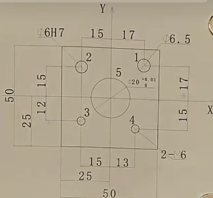点孔 | 【开头】<br/>G17 G21 G40 G49 G80 #取消半径、长度补偿,取消钻孔循环<br/>M03 S1500<br/>G90 G54 G00 X0 Y0<br/>G43 H1 Z50<br/>M08;<br/>【点孔】<br/>G98 G81 X17 Y17 Z-2 R3 F100 #点孔完成后返回安全平面<br/>X-15 Y15<br/>Y-12<br/>X13 Y-15<br/>X0 Y0<br/>【结束】<br/>G80 #取消点孔循环<br/>G00 Z100<br/>G49 #取消长度补偿<br/>M09<br/>M05<br/>M30 |  | | ------------------------------------------------------------ | ----------------------------------------------------- |