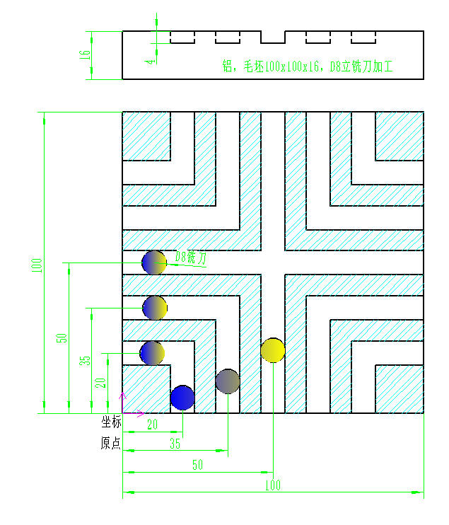 五、对称线槽零件 | 主程序 | 子程序 | 图 | | ------------------------------------------------------------ | ------------------------------------------------------------ | ----------------------------------------------------- | | {-----------程序头--------------}<br/>O0001<br/>(DATA:2025-10-21, PROGRAMMER:TYJ)<br/>G17 G54 G21 G90 G40 G49 G80<br/>M06 T01<br/>M03 S2000<br/><br/>{-----------加工--------------}<br/>#左下角<br/>M98 P0050<br/><br/>#左上角<br/>G68 X50 Y50 R90<br/>M98 P0050<br/>G69<br/><br/>#右上角<br/>G68 X50 Y50 R180<br/>M98 P0050<br/>G69<br/><br/>#右下角<br/>G68 X50 Y50 R270<br/>M98 P0050<br/>G69<br/><br/>{-----------程序尾--------------}<br/>G91 G28 Z0<br/>G90 G28 X0 Y0<br/>M05<br/>M30 | O0050<br/>#第一个槽<br/>G0 X0 Y20 <br/>Z5<br/>G01 Z-4 F80<br/>X20 F300<br/>Y0<br/>G0 Z5<br/>#第二个槽<br/>G0 X0 Y35<br/>G01 Z-4 F80<br/>X35 F300<br/>Y0<br/>G0 Z5<br/>#第三个槽<br/>G0 X0 Y50<br/>G01 Z-4 F80<br/>X50 F300 #最后一个槽不用拐弯<br/>G0 Z5<br/>#子程序结束<br/>M99 |  |