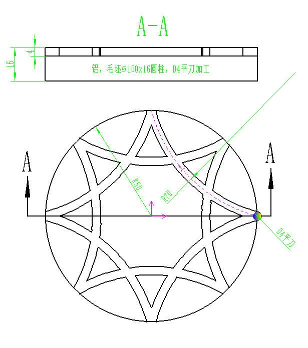 十一、等尺寸圆弧槽零件 | 主程序 | 子程序 | 图 | | ------------------------------------------------------------ | ------------------------------------------------------------ | ----------------------------------------------------- | | O0001<br/>(DATA:2025-10-23, PROGRAMMER:TYJS09)<br/>G17 G54 G21 G94 G40 G49 G80<br/>M06 T01<br/>G00 X50 Y0<br/>Z50<br/>{----------------加工---------------------}<br/>M98 P0053<br/><br/>G68 X0 Y0 R45<br/>M98 P0053<br/>G69<br/><br/>G68 X0 Y0 R90<br/>M98 P0053<br/>G69<br/><br/>G68 X0 Y0 R135<br/>M98 P0053<br/>G69<br/><br/>G68 X0 Y0 R180<br/>M98 P0053<br/>G69<br/><br/>G68 X0 Y0 R225<br/>M98 P0053<br/>G69<br/><br/>G68 X0 Y0 R270<br/>M98 P0053<br/>G69<br/><br/>G68 X0 Y0 R315<br/>M98 P0053<br/>G69<br/>{----------------结束---------------------}<br/>G91 G28 Z0<br/>G90 X0 Y0<br/>M05<br/>M30 | O0053<br/>G0 Z5<br/>G01 Z-4 F80<br/>G02 X0 Y50 R70 F100<br/>G0 Z2<br/>M99 |  |