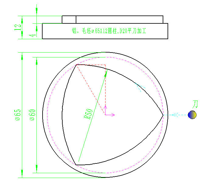 十二、凸轮配合零件 | O0001<br/>(DATA:2025-10-23, PROGRAMMER:TYJS09)<br/>G17 G54 G21 G94 G40 G49 G80<br/>M06 T01<br/>G0 X45 Y0 M03 S2000<br/>G43 H01 Z50<br/>G10 L12 P01 R10<br/>G0 Z5<br/>{------------开始---------------}<br/>G01 Z-4 F80 <br/>G42 D01 G01 X30 F300<br/>G03 X[-30*SIN30] Y[30*COS30] R50 #第1段圆弧<br/>G03 X[-30*SIN30] Y[-30*COS30] R50 #第2段圆弧<br/>G03 X30 Y0 R50 #第3段圆弧<br/>G01 Y15 #往上走一小段<br/>X45 #离开工件<br/>G40 #取消刀具补偿<br/>{------------结束---------------}<br/>G91 G28 Z0<br/>G90 G28 X0 Y0<br/>M05<br/>M30 |  | | ------------------------------------------------------------ | ----------------------------------------------------- |