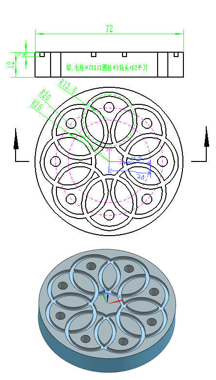 十四、圆环阵列零件 | 主程序 | 子程序 | | ------------------------------------------------------------ | ------------------------------------------------------------ | | <br/>铣槽<br/>O0001<br/>(DATA:2025-10-24, PROGRAMMER:TYJS09)<br/>G17 G54 G90 G21 G94 G40 G49 G80<br/>M06 T01<br/>G0 X7.5 Y0 M03 S2000<br/>Z50<br/>M98 P0051<br/><br/>G68 X0 Y0 R45<br/>M98 P0051<br/>G69<br/><br/>G68 X0 Y0 R90<br/>M98 P0051<br/>G69<br/><br/>G68 X0 Y0 R135<br/>M98 P0051<br/>G69<br/><br/>G68 X0 Y0 R180<br/>M98 P0051<br/>G69<br/><br/>G68 X0 Y0 R225<br/>M98 P0051<br/>G69<br/><br/>G68 X0 Y0 R270<br/>M98 P0051<br/>G69<br/><br/>G68 X0 Y0 R315<br/>M98 P0051<br/>G69<br/><br/>G0 Z100<br/>钻孔<br/>M06 T02<br/>G0 X26 Y0 M03 S2000<br/>Z50<br/>M98 P0052<br/><br/>G68 X0 Y0 R45<br/>M98 P0052<br/>G69<br/>G68 X0 Y0 R90<br/>M98 P0052<br/>G69<br/>G68 X0 Y0 R135<br/>M98 P0052<br/>G69<br/>G68 X0 Y0 R180<br/>M98 P0052<br/>G69<br/>G68 X0 Y0 R225<br/>M98 P0052<br/>G69<br/>G68 X0 Y0 R270<br/>M98 P0052<br/>G69<br/>G68 X0 Y0 R315<br/>M98 P0052<br/>G69<br/><br/>G91 G28 Z0<br/>G90 G28 X0 Y0<br/>M05<br/>M30 | < <br/>子程序1<br/>O0051<br/>G0 Z5<br/>G01 Z-2 F30<br/>G02 I-12.5 F80<br/>G01 Z5<br/>M99<br/>子程序2<br/><br/>O0052<br/>G0 Z5<br/>G01 Z-14 F30<br/>Z5 F500<br/>M99<br/><br/><br/><br/><br/><br/><br/><br/><br/><br/><br/><br/><br/><br/><br/><br/><br/><br/><br/><br/><br/><br/><br/><br/><br/><br/><br/> |