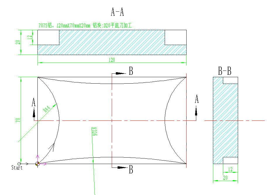 十八、圆弧台阶对称零件 | 主程序 | 子程序 | 图 | | ------------------------------------------------------------ | ------------------------------------------------------------ | ----------------------------------------------------- | | O0001<br/>(data:2025-10-27, programmer:tyjs09)<br/>G17 G54 G21 G94 G90 G40 G49 G80<br/>M06 T01<br/>G0 X0 Y0 M03 S2000<br/>G43 H01 Z50<br/>G0 Z5<br/>G10 L12 P1 R10<br/>G41 G01 X-15 Y0 D01 F300<br/>#1=-2<br/>M98 P0051 L6<br/>G40 #取消半径补偿<br/>G91 G28 Z0<br/>G90 G28 X0 Y0<br/>M05<br/>M30 | O0051<br/>G01 Z[#1] F80<br/>G03 Y70 R44 F300<br/>X120 R336<br/>Y0 R44<br/>X0 R336<br/>G01 X-15<br/>G0 Z5<br/>#1=#1-2<br/>M99 |  |