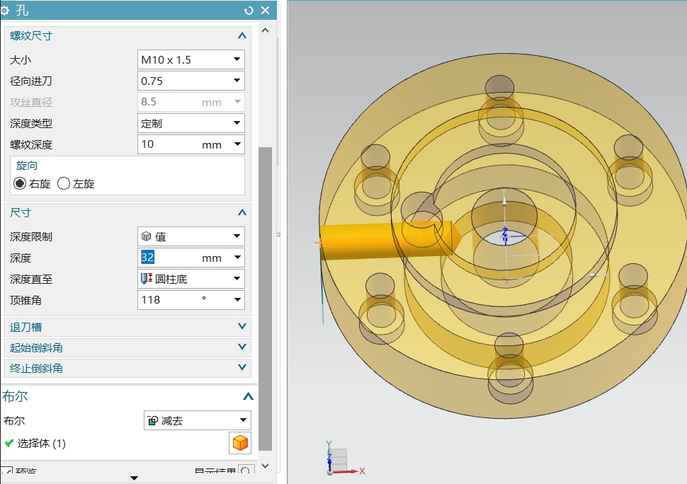 ## 第一章UG NX12.0简介 ### 1.1UG文件新建及保存 (1)新建文件的时候注意过滤器的单位,应该是毫米 (2)NX10.0开始支持中文,低于此版本,文件名及路径都不能有中文 (3)新建文件快捷键ctrl+N (4)文件保存快捷键ctrl+s ### 1.2UG界面编辑 菜单--文件--实用工具--用户默认设置--常规--目录--修改部件文件目录 菜单--文件--实用工具--用户默认设置--常规--部件--将单位设置成毫米 3显示十字光标 ``` 菜单栏--首选项--选择(ctrl+shift+T)--勾选显示十字准线--确定 ``` 4加载角色文件 ``` 菜单--首选项--用户界面--角色--加载角色 ``` 文件--新建--在顶部菜单图标栏的空白处单击鼠标右键勾选上你想使用的工具栏 最左侧角色--内容--高级角色(可以把所有的工具都释放出来,恢复到调整前的状态) 更改主题:菜单--首选项--用户界面--主题 顶部菜单空白地方右键--定制--命令栏--所有选项卡--按住鼠标左键拖到直接草图到菜单栏空拍区域 ### 1.3鼠标的操作 更改图像显示颜色:ctrl+j或菜单编辑对象显示---然后用鼠标选择图形后点击确定就可以更改颜色了 将鼠标停留在图形上一小会儿看见?后单击左键就会弹出快速选取对话框,此时我们就可以随意选择自己想要的元素 中键前后混动就是放大缩小,按住不放就是旋转 右键就是菜单键,不同的地方右键会弹出不同的菜单 双击图像可对其进行编辑 ### 1.4右键菜单 画好图后在绘图区空白区域内单击鼠标右键会出现很多菜单,每个菜单都体验一下就知道是啥功能了,基本都是对视觉效果的控制。 空白地方和零件上的右键菜单是不一样的 ### 1.5组合键及推拉菜单 左键(ctrl)+中键:放大缩小 右键(shift)+中键:平移 打开不同的推拉式菜单(重点,非常常用):ctrl+shift+左键/中键/右键 定制菜单栏:点击任意菜单右侧的小三角--选择定制(或者快捷键ctrl+1),然后却换到快捷方式选项卡--点击查看,此时屏幕上会出现3个菜单,此时你可以点击定制窗口中的“重置工具条”,“重置圆盘菜单”,“重置菜单”三个按钮进行默认菜单显示恢复,然后把查看圆盘工具栏里的艺术外观移除,把试图快捷菜单里的撤销命令拖拽到圆盘工具栏里,此时再回到绘图区后在零件上按下鼠标右键就会出现你定制的九宫格工具栏,拖动零件到不同的方向就会给你执行不同的命令,这就是很多老师傅操作而你却看不到他是怎么操作的原因。 ## 第二章UG草图模块 ### 2.1进入草图 (1)电脑自带三个相互垂直的面xy/xz/yz平面。 (2)曲线--创建草图,因为草图属于二维平面 ``` 1打开ug新建一文档,然后点击草图打开创建草图对话框,在绘图区选择“xy面”后点确定进入草图 2在快速尺寸旁边有个更多的按钮点击此按钮--在草图环境中打开,此时草图环境就会出现很多常用的图标,然后点击完成草图图标退出草图环境 3点击拉伸按钮--点击绘制截面按钮--在绘图区选择一个面确定后进入到草图中,此时你看到的草图就是上一步你配置好的草图空间了,点击完成退出草图空间 ``` (3)指定平面的时候可以创建一个平面,和指定参考方向。 ``` 草图--创建草图---指定平面(选择按某一距离)--在绘图区中选中一个截面,然后用鼠标拉着箭头输入截面相对于绝对坐标的距离,然后点击草图方向里的指定矢量并在绘图区选一个坐标轴作为草图的横轴,此时部件的坐标系就定义好了 在创建草图对话框中还有一个草图远点方法,我们选择指定点,然后选择零部件上的某一个点作为部件坐标系的原点 ``` (4)坐标乱之后,可以利用右键推拉菜单快速恢复。 ### 2.2直线圆工具 https://www.bilibili.com/video/BV1Ji4y1M7mW/?p=7&spm_id_from=pageDriver&vd_source=a0da63e55f7583b5a5b6f287b5b80deb (1)捕捉记得打开,自动添加约束打开。 (2)可以先绘制图形,后标注尺寸,尺寸驱动元素,称之为参数化。 双击标注尺寸可以修改实体形状大小,这一点和autoCAD不一样 (3)尺寸可以输入数值或者算式。 (4)可以自定义添加约束关系。 几何约束的作用:几何约束用于建立草图对象的几何特征,或者建立两个或多个对象之间的关系,在创建草图时,用户不必在意尺寸是否准确,只需绘制大致轮廓即可。草图的准确尺寸、形状、位置,通过尺寸约束、几何约束和定位约束来确定(尺寸修改前的标注是浅蓝色的,尺寸修改后的颜色是深蓝色的,当出现两种颜色后我们就要对其进行几何约束),哪怕你的尺寸正确也要进行约束 (5)进入一下圆内部,然后再出来可以更改直线方向。 示例一了解几何约束 ``` 打开软件进入草图--选择自动判断--选择xy平面--确定 点击快速尺寸旁边的更多下拉菜单--选择在草图任务环境中打开进入常规环境,此环境页面和autoCAD页面类似,、 线段与x轴共线并且线端点与y轴重合 画一条线段--右键修改标注尺寸--点击几何约束图标打开约束对话框--选择共线图标--点击要约束的对象---在绘图区选择刚画的线段--点击选择要约束到的对象--点击绘图区的x轴后你会看到线段已经和x轴在同一水平线上了 点击点在曲线上图标--选择要约束的对象--点击绘图区线段的端点--选择要约束到的对象--点击绘图区y轴,此时你会看到线段完全和坐标原点重合了,而且ug软件最下方的状态栏已经提示:草图已经完全约束 ``` 示例二几何约束实战演练  ``` 技巧:alt+tab快捷键可以在不同软件中切换 进入草图随便画一个同心圆,然后修改圆的半径为33和38,然后在随意一个地方画半径25和直径36的同心圆 点击几何约束--点
